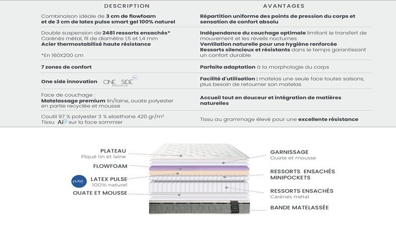Combinaison idéale de 3 cm de flowfoam et de 3 cm de latex pulse smart gel 100% naturel
